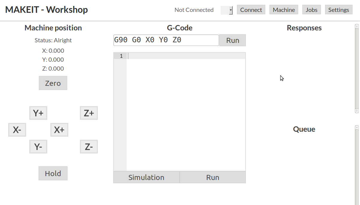 The workshop or CNC app has to handle all communication with the controller running the CNC machine. This includes connecting/disconnecting, sending commands and receiving responses. It has to be compatible with GRBL, one of the most popular pieces of software for hobby CNC controllers. There are other controllers (tinyG, smoothie board) that are also based on GRBL and so accept the same commands. The app has to run in the broswer and connect to the controller via a serial (usb) port.